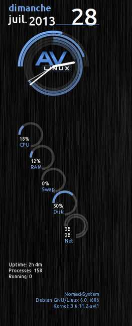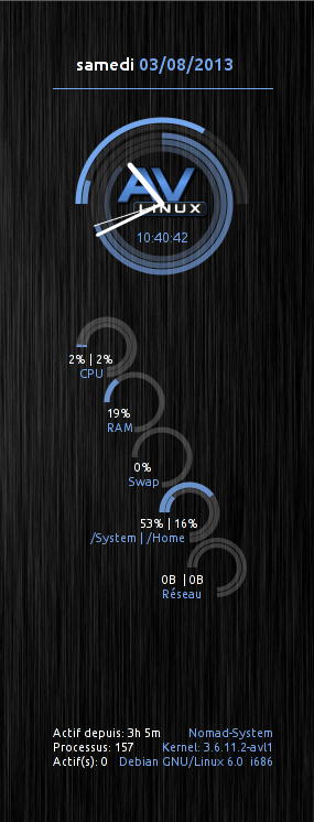 Le gestionnaire de statistiques Conky est conçut pour ne pas avoir d'impact sur le cpu et la ram.Aussi son aspect se gère depuis deux fichiers dans votre /home (afficher les fichiers cachés) ,