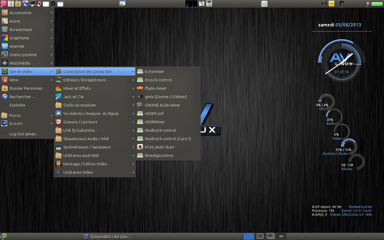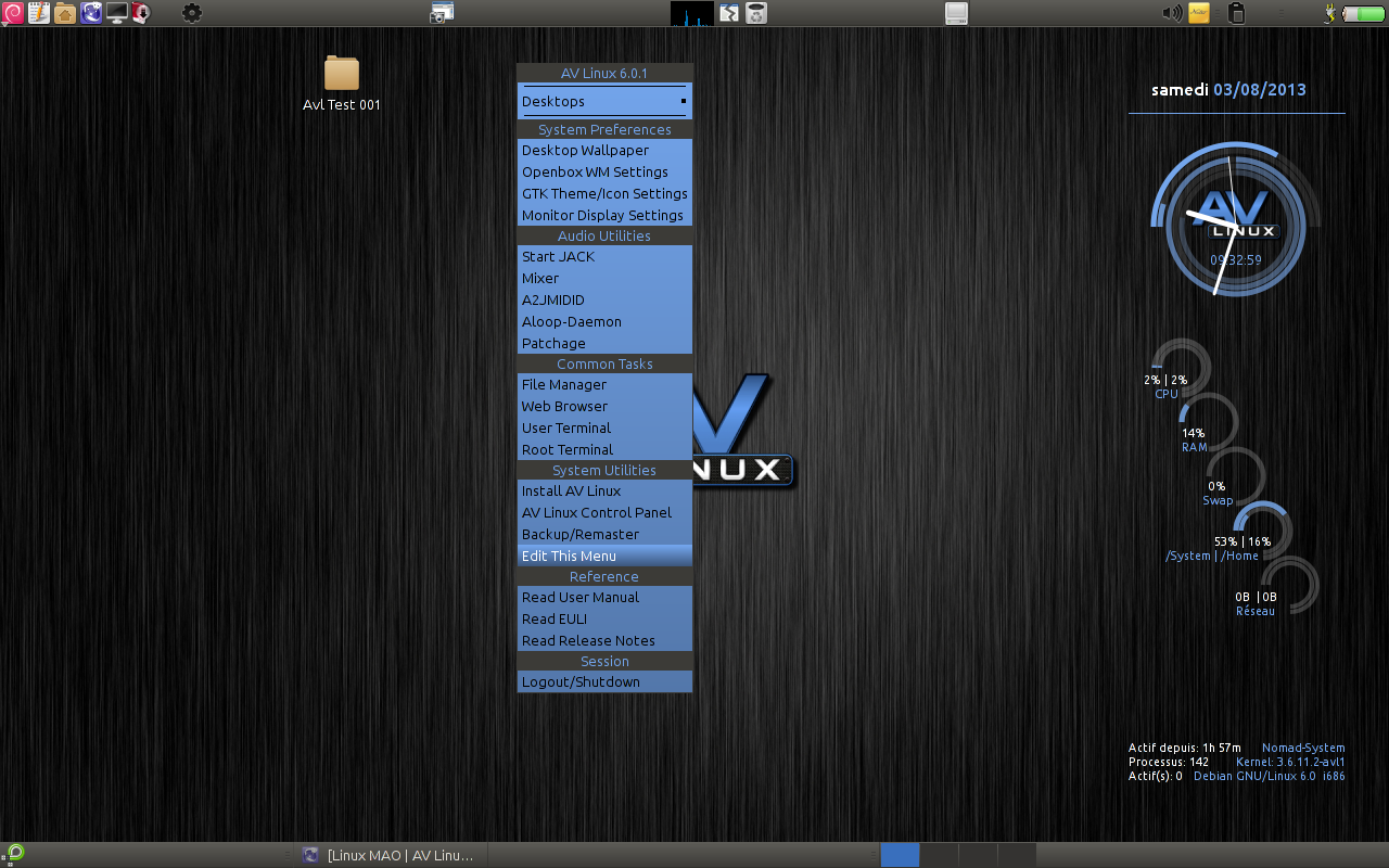 S'il est vrai qu'AV Linux est dotté d'une belle brochette d'applications mais on pourra tout de même constater une certaine organisation déstructurée du menu multimédia ce qui est pour le moins agaçant de chercher de chercher une application vu la longueur de la liste déroulante.Bien entendu vous pouvez utiliser et éditer le "Mini Menu" qui est sur le bureau , mais il a au moinsq 3 contraintes: