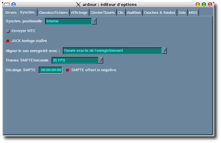 - Synchro. positionnelle : peut être positionné à interne, Synchro avec Jack ou Esclave du MTC. Avec le premier choix, Ardour sera autonome du serveur Jack, dans le deuxième cas, le serveur Jack prendra la main pour la lecture et la pause. Cette fonctionnalité peut être étendue à l'utilisation de Jack à plusieurs logiciels chaîné entre eux, permettant leur gestion centralisée.