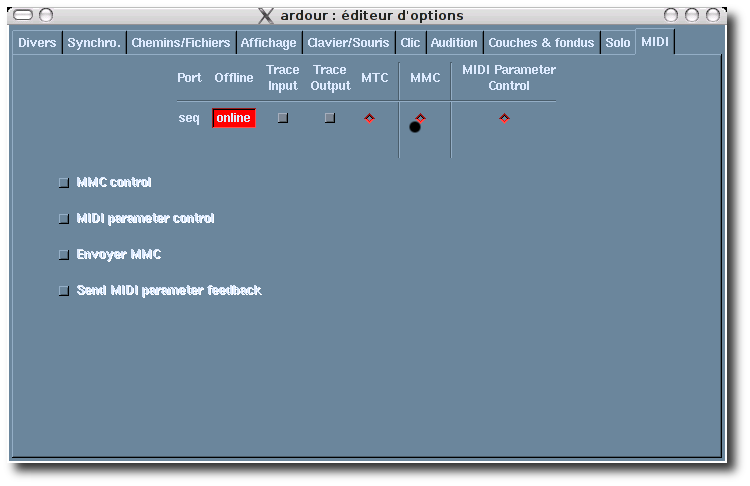 - Envoyer MTC : permet de synchroniser Ardour avec une interface MIDI. MTC veut dire MIDI Time code. Si cette case est cochée, Ardour se synchronisera avec les horloges des interfaces MIDI.