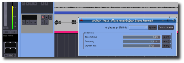Maintenant, on peut s'amuser à rajouter des effets. Pour cela, il faut donc sélectionner une piste (je vais commencer par la voix), Il faut afficher la tranche de mix (CTRL + E) puis cliquer dessus avec le bouton droit et choisir: Nouveau plugin