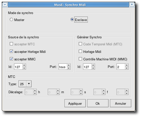 Côté MusE : ça se passe dans le menu Settings, Synchro MIDI :