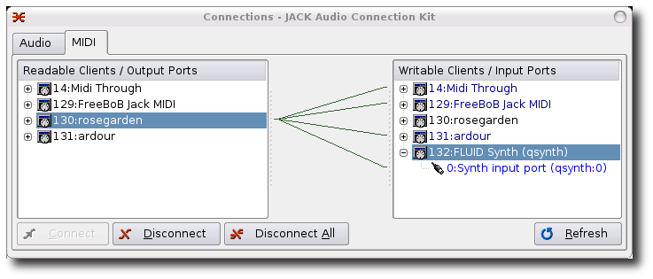 Le schéma de branchement à l'aide de Jack se fait comme ceci : • Au niveau Audio, nous effectuerons les branchements directement dans Ardour. • Sur l'onglet MIDI : voir l'image ci après) |
