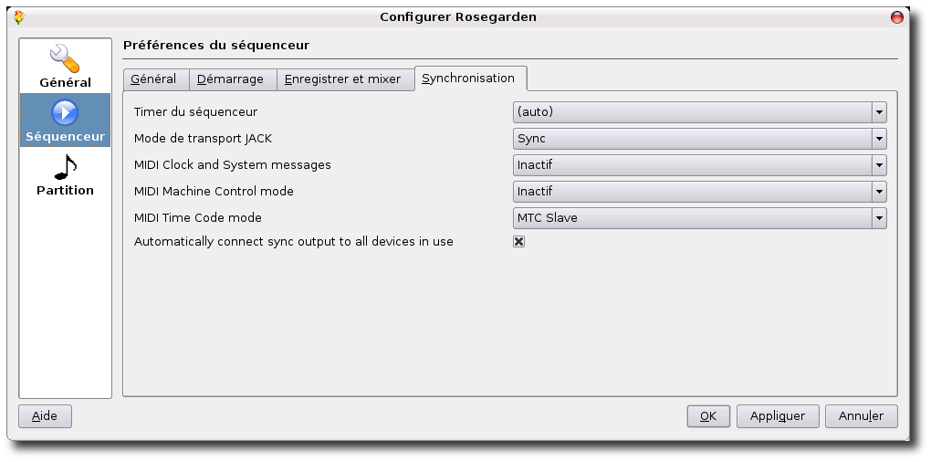 Il vous suffit dans Rosegarden d'aller dans le menu Configuration, puis dans l'onglet séquenceur d'activer le mode de transport Jack sur Sync comme le montre la figure suivante :