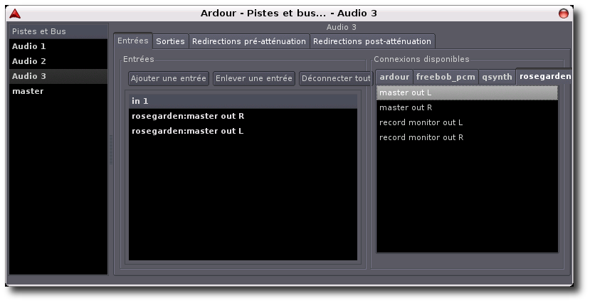 Nous allons assigner la piste 3 à l'entrée Rosegarden, pour cela il faut nous rendre dans Fenêtre/pistes et bus de sélectionner la piste Audio 3 puis d'aller dans Entrée et à l'extrême droite de sélectionner Rosegarden pour assigner les pistes master L et Master R (bien que vous puissiez répéter l'opération en assignant la voix droite de rosegarden à audio 3 et la gauche à audio 4 pour conserver l'effet stéréo).