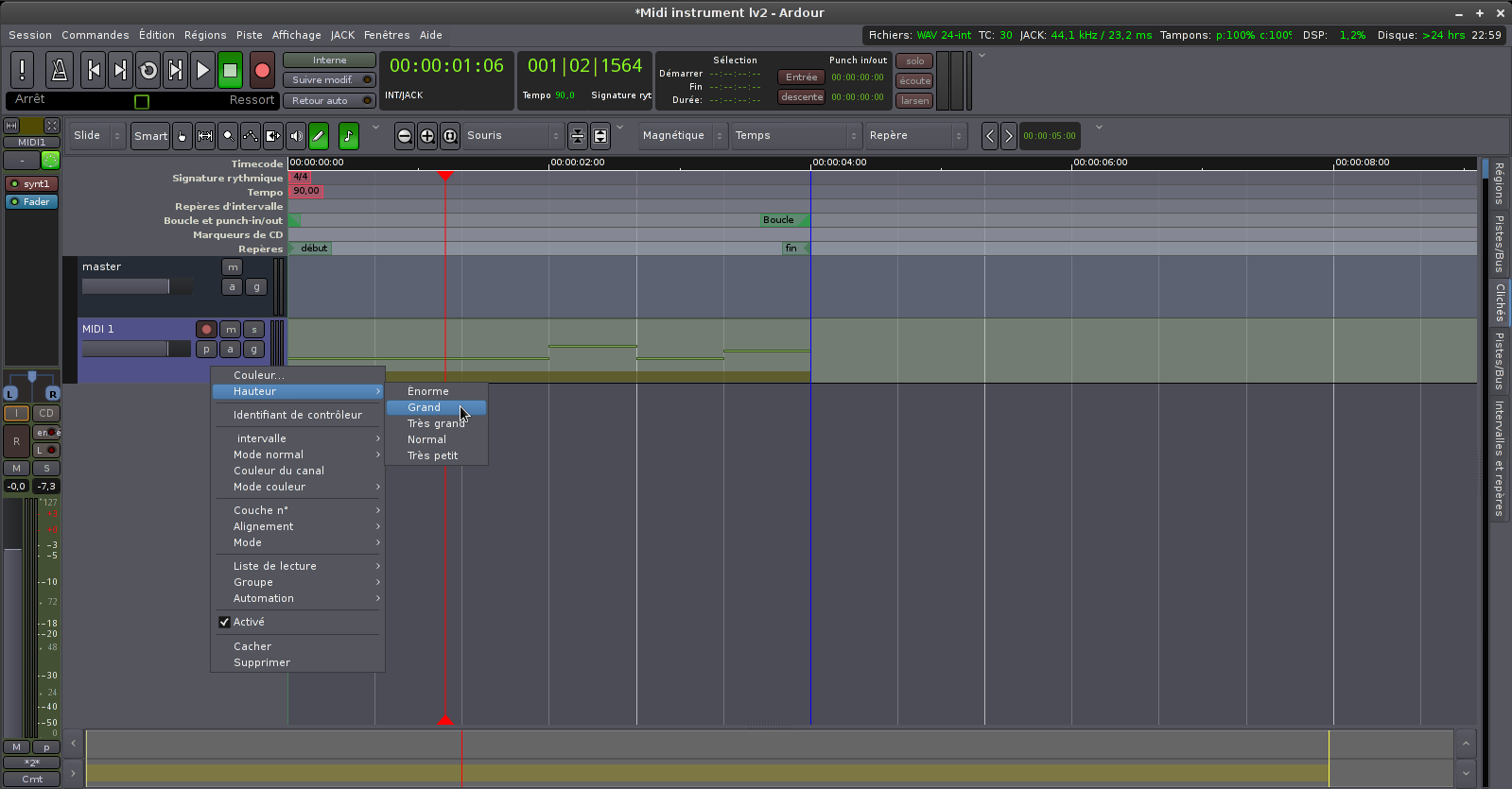 Il est fort probable que vous auriez envie de jouer cet échantillon en boucle donc il suffit d'allonger la mesure et la durée de la note depuis l'éditeur de Ardour et n'oubliez pas de passer le paramètre LOOP sur ON!