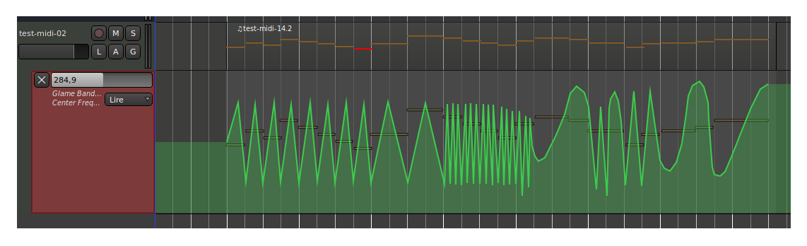 Nous constatons que les événements automation MIDI sont conservés. Dans le principe, nous pouvons étrécir/étrirer la région autant de fois que nous le souhaitons et revenir à la position d'origine.