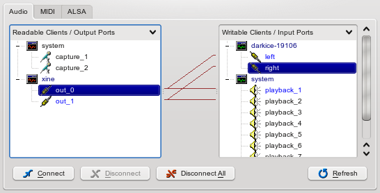 La seule chose à savoir c'est que vos entrées Oddcast auront des noms de la forme bio2jack_0_32083:out_0 et bio2jack_0_32083:out_1 qu'il vous suffira de relier aux sortie d'Ardour 3.