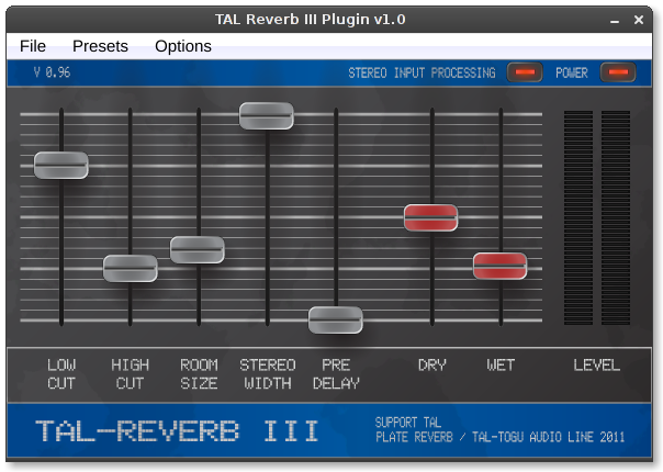 Accueil Logiciels > Portail des Logiciels > Catégorie effets audio > DISTRHO TAL Reverb 3 TAL Reverb-3 est une réverbération Table des matièresInformations Description Utilisation Installation Informations Site web officiel : http://kunz.corrupt.ch/ Version actuelle : Licence : Plateforme : GNU Linux Support : Alsa, Jack, Alsa-MIDI, jack-MIDI, OSS, PortAudio Développeur(s) : Description ... Utilisation ... Installation[+] Voir DISTRHO.