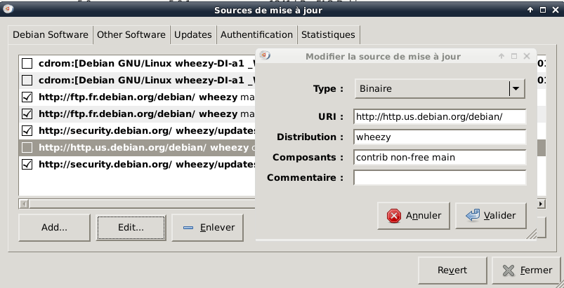 REM : pensez à désactiver ce dépôt une fois l'opération finie (enlever 'non-free' à la ligne 'composant'), en effet il est plutôt recommandé de n'utiliser que le dépôt de base, et pas les non-free et multimédia etc.. pour la MAO.