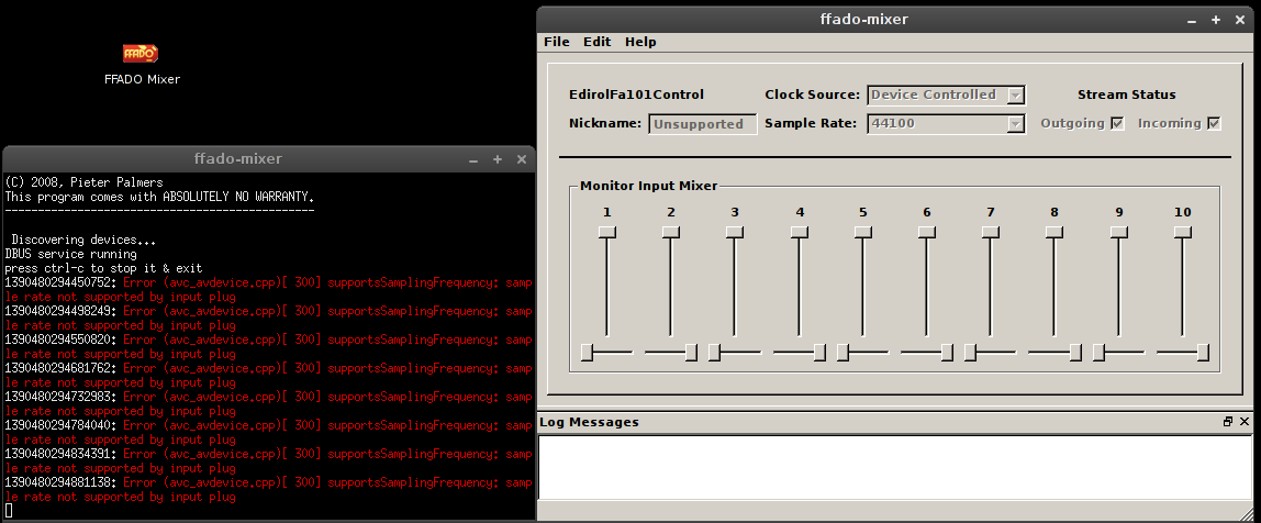 Depuis la connexion sur un port FireWire d'un pc de bureau il est possible d'alimenter la FA-101. FFADO-Mixer voit bien la carte mais après vérification, vous ne pourrez que régler les niveaux d'entrées et de position stéréo. La configuration de la carte quand à elle restera grisée.