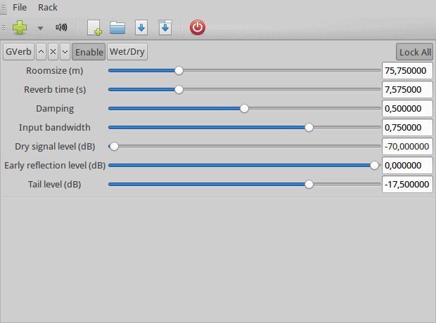 Dans le détail. Tu lances "jack-rack". Dans le menu de Jack-rack, tu choisis "Rack -> add -> simulators -> Reverbs -> Gverb". Tu cliques sur "enable". C'est fini avec Jack-rack pour le moment. Tu joueras plus tard avec les différents réglages pour obtenir le son qui te convient. En ce moment, tu dois voir à peu près ça :