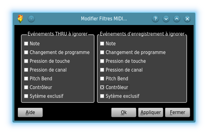 La case "Ignorer les événements non traités" est également cochée, elle a son importance. Contrairement à midifilter.lv2 qui bloque ce qu'on lui demande, qmidiroute va laisser passer (éventuellement transformer, mais on ne lui demandera pas dans ce cas précis) ce qu'on lui demande, et bloquer tout le reste.
