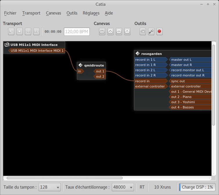 Enfin, dans Catia, je connecte "USB Midi Interface" (par où arrivent les données du clavier) sur "MIDI Event Filter" avant de le brancher en enregistrement sur rosegarden.