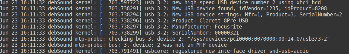 - le support de l'interface est amélioré depuis Mars 2024 par le pilote ALSA:snd-usb-audio(scarlett2) du noyau Linux 6.10