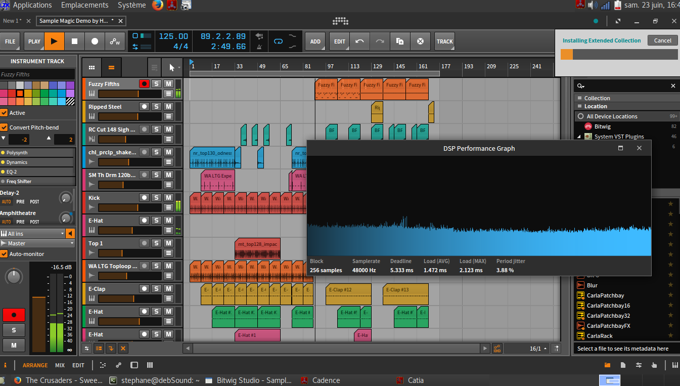 Test sous Bitwig avec 32 pistes (instruments virtuels, effets, plugins, installation en parallèle de toutes les banques sons, avec le mode économie énergie car sur batterie ...), ça ne bronche pas pour un ordinateur de 2012.