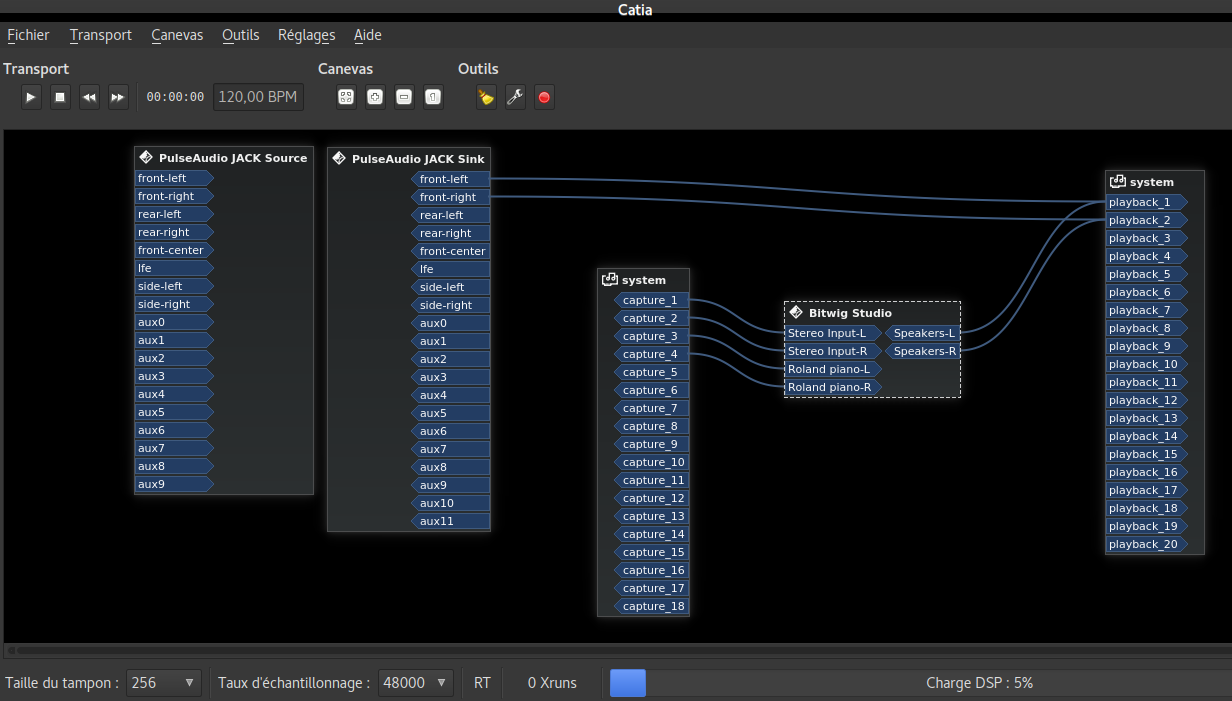 Sous Catia (ou Patchage) vous aurez donc cette vue, avec le pont PulseAudioJack démarré (dans mon cas avec BitWig lancé) ...