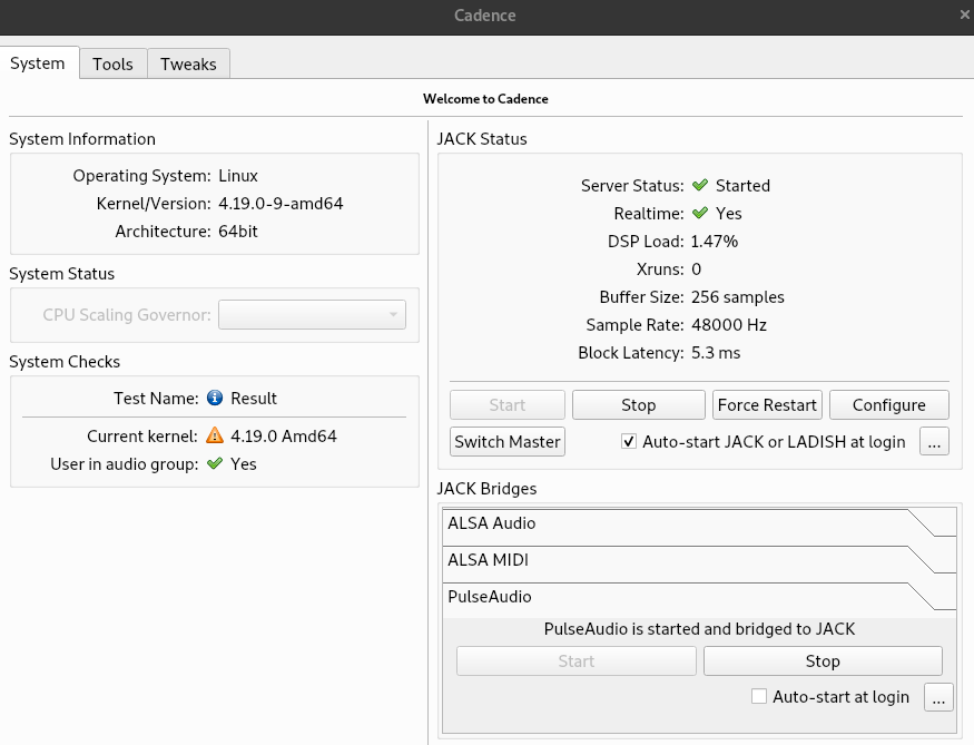 Avec une mise à jour récente sur la Debian 10 Buster, sous Cadence, il n'est plus nécessaire de lancer le bridge Pulse Audio (PulseAudio is started and bridged to JACK) : vous pouvez décocher "Auto-start at login".