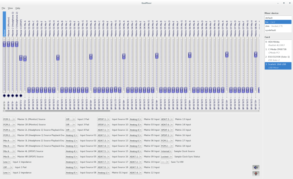 Ça n'est toujours pas satisfaisant, QasMixer n'est pas prévu pour des cartes avec un DPS et/ou des mixages internes. De plus son développeur principal ne le maintient plus. Il n'y a donc que peu de chance de voir le produit évoluer.(Note: il semblerait que le développement de QasMixer aie repris. Le dernier snapshot date du 27 avril 2016). Ça reste toutefois une solution de dépannage sur certaines distribs ou on trouve encore QasMixer dans les dépôts non officiel.Dans l'exemple ci-dessous. Le mixeur est configuré pour avoir un retour direct [sans passer par jack] des entrées "stéréo [1-8]" sur le "casque-2". Alors que le "casque-1" comme les sorties "monitor 1&2" sont configurées pour sortir sur le "PCM-1/2". À noter qu'il n'y a pas de contrôle de volume pour les sorties PCM, il faut donc utiliser les boutons "volume" de la carte.