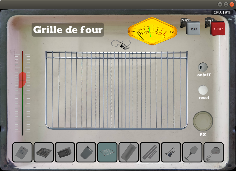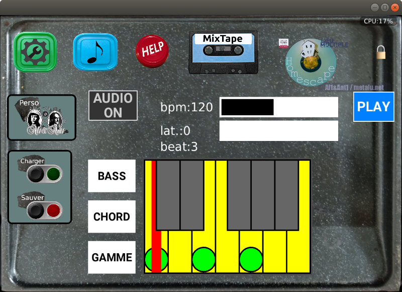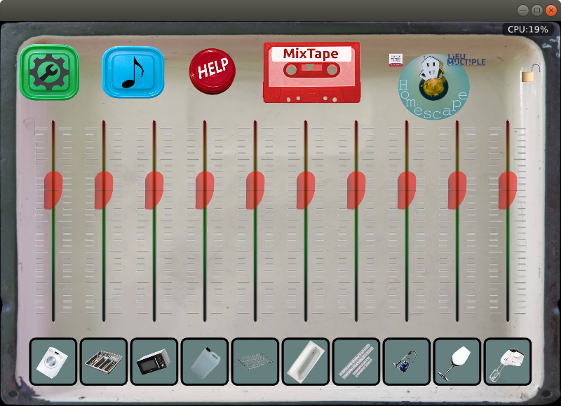 - À l'ouverture, on arrive sur la page de jeu, c'est une console de mixage (avec des faders en haricot) pour muter (couper), et démuter (ouvrir) les tranches (sons), il suffit d'appuyer sur les haricots d'une manière brève et sans bouger, quand on bouge et qu'on laisse appuyé en même temps, ça monte et ça baisse le fader de volume du son.