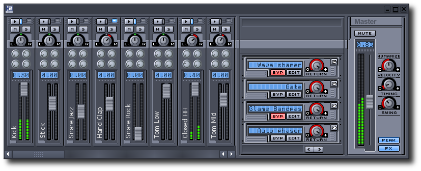 • d'un bouton MUTE : qui permet de mettre tout en sourdine, • du nombre dans le rectangle bleu : c'est une indication du gain (volume sonore) maximal de cette piste, • du charriot vertical : notre moyen de contrôler le volume général, • des 2 lignes vertes-jaunes verticales : l'autre moyen du volume général, plus précis et plus visuel, les 2 lignes sont liées à la panoramisation droite-gauche, • de la section d'humanisation (HUMANIZE) destinée à donner un côté humain à notre boîte à rythme à l'aide : == d'un potentiomètre VELOCITY : qui influe aléatoirement sur la puissance des coups joués, == d'un potentiomètre TIMING : qui influe aléatoirement sur la rigueur du tempo des coups joués, == d'un potentiomètre SWING : qui donne un effet ternaire aux coups joués, • du bouton PEAK : qui active/désactive les lignes vertes-jaunes, • du bouton FX : qui ouvre un rack d'effet LADSPA que nous allons voir ci-dessous. |