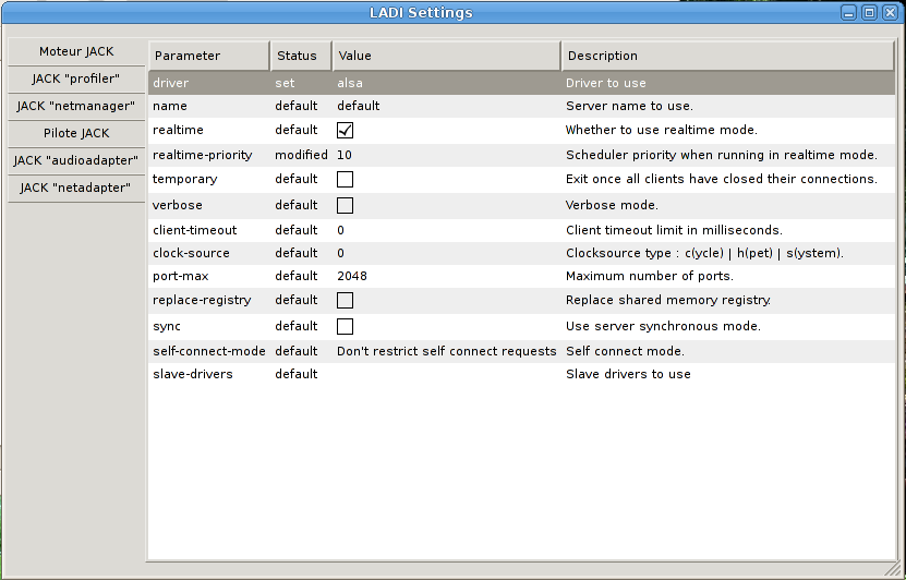 Voici une capture d'écran de ce que vous devriez obtenir dans l'onglet paramètres des réglages de QJackCtl.