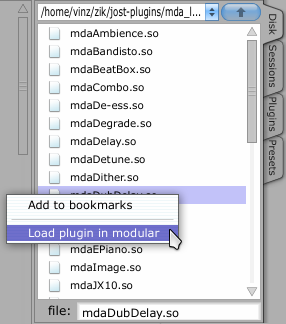 Il faut bien sûr avoir téléchargé les VST natifs voulus. Pour ceci le site de JOST, Jucetice, est une bonne adresse ! Il y a aussi les greffons MDA qui sont excellents, par contre sans interface graphique. Plus d'informations sur la page des greffons VST natifs.