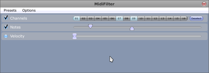 - Un filtre MIDI permettant de changer les canaux, notes et volumes (midi filter)