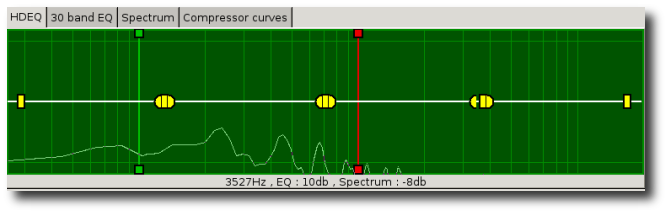 Il est à noter que dans l'égaliseur 1023 bandes vous pouvez faire ce dernier réglage à la souris dans la fenêtre de réglage, par contre lorsque vous passerez avec les autres modes (égaliseur 30 bandes) vous n'aurez plus cette représentation graphique et vous devrez passer par les deux potentiomètres horizontaux juste en bas de cette fenêtre. Celui du haut étant affecté au trait vert, et celui du bas au trait rouge.