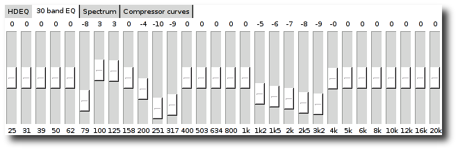 Comme on le remarque, la courbe qui avait pu être définie sur l'égaliseur 1023 bandes est bien entendue conservée dans l'égaliseur 30 bandes et les potentiomètres suivent les placements de la courbe précédente.