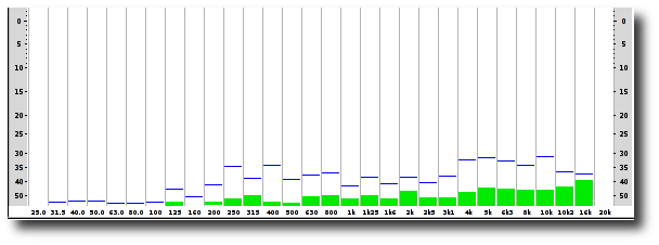 Sous la forme des 30 paliers de l'éditeur 30 bandes vous voyez là, la représentation en décibel de chaque tranche. Les petites lignes bleues représentent chaque niveau maximal atteint.