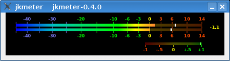 Jkmeter peut être affiché horizontalement ou verticalement. C'est le genre de crête-mètre utile pour l'enregistrement, le mixage ou le mastering. Un K-mètre affiche à la fois le véritable niveau RMS (valeur efficace) et le niveau des pics numériques. Sur celui-ci, l'affichage du RMS est dans les 15% plus rapide que sur un VU-mètre, mais sans le dépassement. Ça donne une bonne indication du volume subjectif.