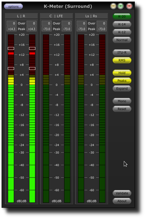 .K-Meter stéréo est un VU-mètre à 2 canaux tandis que la version surround est un VU-mètre 6 canaux.