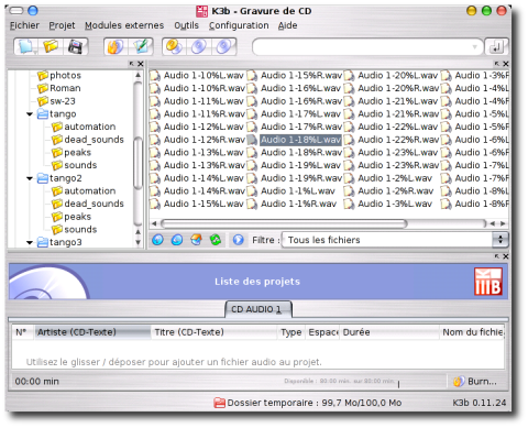 - Dans la fenêtre audio, on peut faire glisser des fichiers du type .wav, .ogg... (qui seront automatiquement convertis en .cda pouvant être lus sur une chaîne Hi Fi) mais n'essayez pas de faire glisser du .mid, .aif ou autre format incompatible ! (sauf dans le cas de gravure de données dans l'autre fenêtre par exemple).