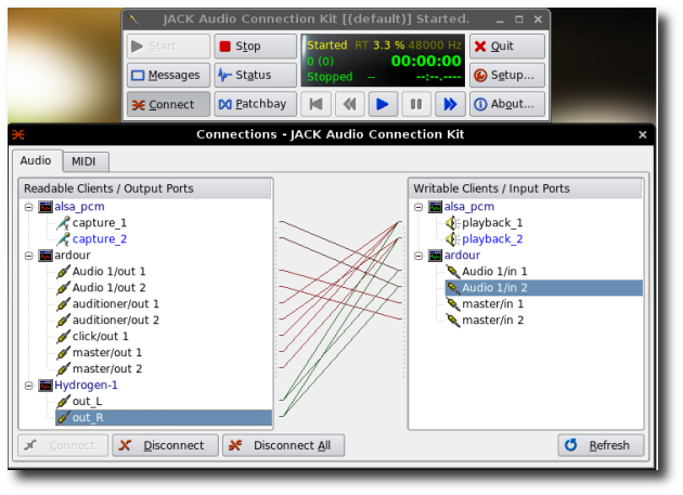 L'utilisation de QJackCtl pour les connections est très pratique.➡️ Je complèterai l'article. Entre temps, en discutant sur le canal irc #linuxmao, LeGreffi3R m'a proposé d'enregistrer une vraie basse dont vous pourrez écouter le mix avec Hydrogen ici : http://www.linuxmao.org/tikiwiki/tiki-list_file_gallery.php?galleryId=8