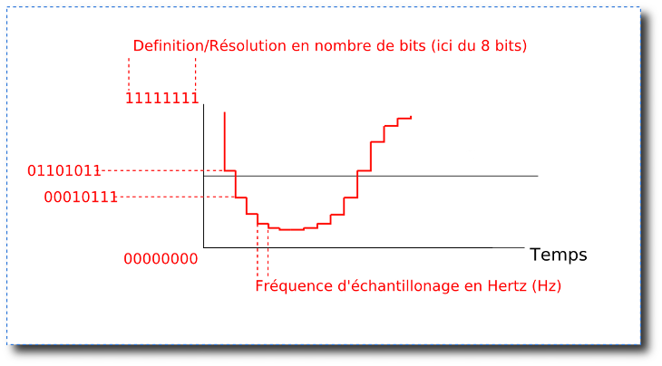 Vous avez compris le principe, l'idée va être de coder les échantillons sur des mots composés de plusieurs bits. Plus le nombre de bits est élevé, plus l'échantillon sera précis.