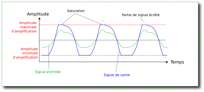 Quand on souhaite amplifier un signal de manière extrême, on va atteindre voire dépasser la limite de puissance de l'amplificateur. Dans ce cas, toutes les valeurs qui devaient se retrouver supérieures à la limite vont être coupées. On appelle ça écrêter. On obtient alors un son très connu dans le rock car très utilisé sur les guitares : la saturation ou distorsion. Elle peut être plus ou moins forte pour un son crunchy, rock ou thrash.Ci-dessous un schéma qui montre comment le son est altéré avec la saturation.