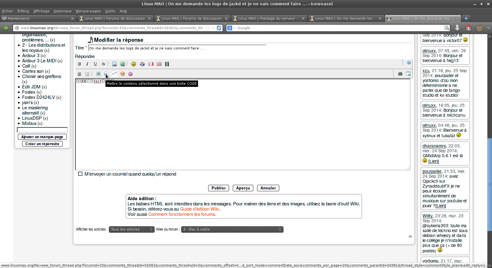 Avant propos : les forums sont une des nombreuses facettes de LinuxMAO. Ils permettent d'échanger, de résoudre des problèmes, d'apprendre des techniques, de demander conseils... Ils ne sont pas modérés à priori, c'est-à-dire que tous les inscrits et connectés au site peuvent y écrire librement.