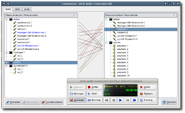 J'ai utilisé le logiciel ZynAddSubFx, un clavier Midi Korg Triton, Ardour 3 2.7, hydrogen et le couple jackd / QJackCtl permettant de relier l'ensemble.- QJackCtl - connexions :
