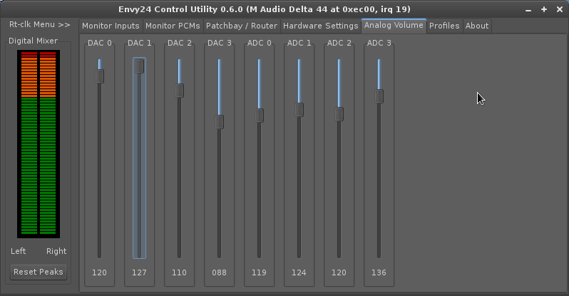 Remarque : les deux captures d'écran d'alsamixer et d'envy24 correspondent au même état : on remarque que 100 signifie 100% pour alsamixer, quand cela signifie 127 en OUT (DAC) pour envy24 et 163 en IN (ADC).