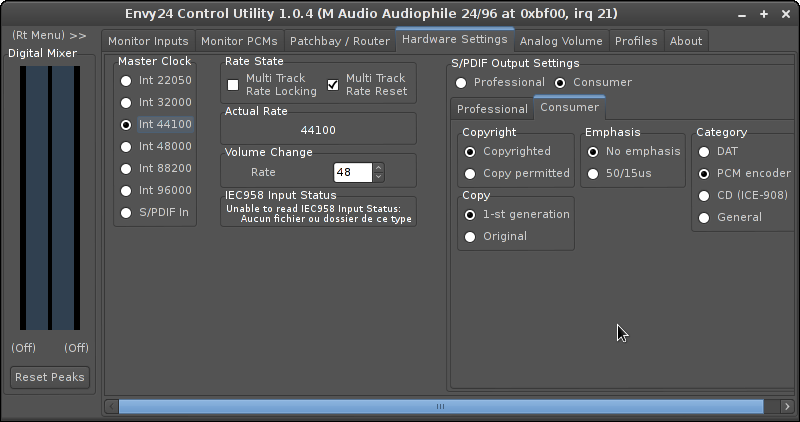 - Envy24Control : contrôles concernés : onglet analog volume : ADC