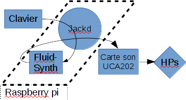 À la lumière de nos essais précédents qui s'étaient déroulés sans carte son externe, on a opté pour une chaîne audio basée sur Jackd (interface graphique : Qjackctl) et Fluidsynth (interface graphique : Qsynth) associé au fichier de formes Fluid-soundfont-gm. Le clavier maître est connecté au Raspi par USB, ceci assurant également son alimentation électrique. L'ensemble est représenté dans la figure ci-dessous :