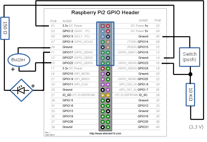 Le câblage est décrit par le schéma ci-dessous:Le buzzer provient d'une carte mère mise au rebut. Il s'agit d'un buzzer passif, il faut donc l'alimenter avec un signal carré à une fréquence qu'il est susceptible de restituer (voir le code dans la suite).