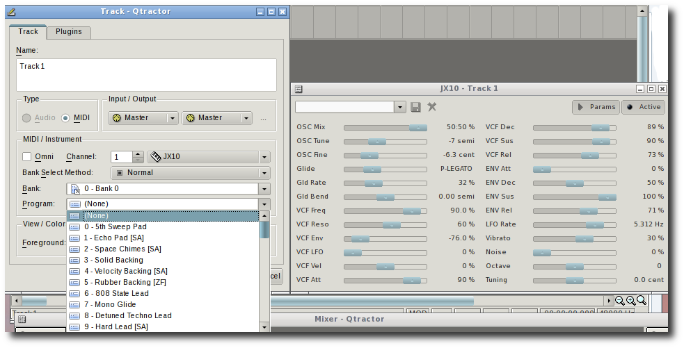 Le mda JX10, avec son son 'vintage' agréable et des bons pré-réglages en tant que VST natif dans le séquenceur et hôte Qtractor. Les pré-réglages sont listés dans la menu déroulant des propriétés de la piste alors que l'interface QT4 pilote les paramètres détaillés du synthétiseur :