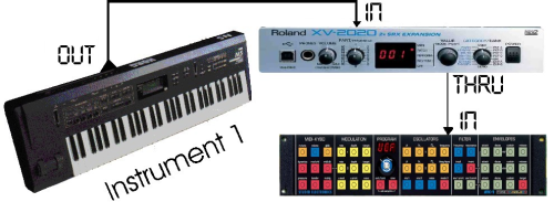Le langage MIDI prend toute son importance grâce à un câble reliant les deux appareils. La sortie Out de l’instrument 1 est reliée à l’entrée In de l’instrument 2.