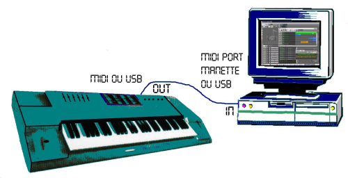 > Connecteur MIDI IN dans MIDI OUT (sortie clavier) > Connecteur USB dans unité centrale (actuel bien que sujet à décrochages, blocages suivant marques ❗.