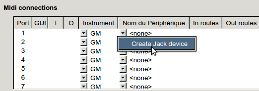 Pour ajouter une entrée-sortie JACK MIDI, cliquez sur la flèche dans la colonne Nom du périphérique et sélectionnez Create Jack device :