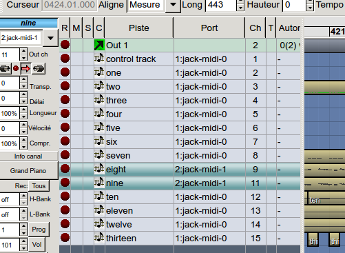 Ici deux pistes sortent dans Sorcer et les autres dans QSynth, ce dernier pouvant associer chaque piste à des instruments différents.