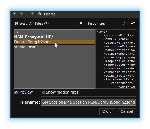 Avant de remplir ce formulaire de proxy, vous allez copier le fichier de projet Hydrogen que vous voulez intégrer à la session (par exemple "monfichier.h2song") dans le répertoire de votre session NSM (à priori /"home/utilisateur/NSM Sessions/MaSessionNSM/").