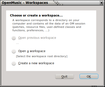 La documentation complète en anglais et des tutoriels sont disponibles ici.Au lancement un dialogue propose de créer ou d'ouvrir un espace de travail :